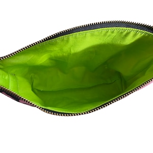 アフリカンプリントを使用した、カラフルで個性豊かなポーチ。少し横長で浅めの形は中身が見やすく、必要なものをスムーズに取り出せます。長めのファスナーで大きく開き、使いやすさも抜群。ファスナーを取っ手代わりに指に掛けて持ち運べるのも嬉しいポイントです。化粧品やデジタル機器、小物入れなど幅広い用途でお使いいただけます。