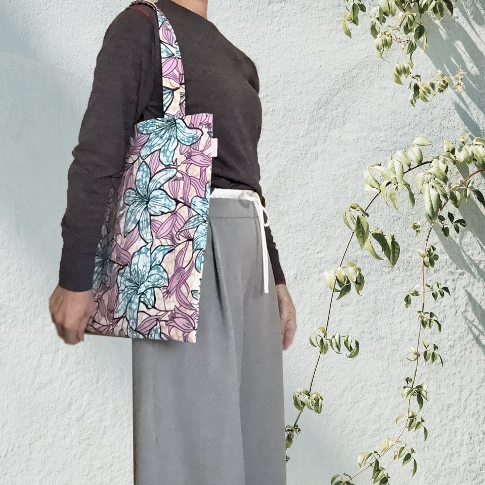 プリント柄が持つ力強さと、洗練された配色バランスが、装いに上質なアクセントを添えます。裏地にはビビッドなピンクを使用、便利なポケット付き。リバーシブルでもお使いいただけるため、気分や装いに合わせて異なる表情を楽しめます。鮮やかな色使いと独特な柄が、いつものスタイルに華やかさをプラス。お揃いのポーチもございます。通勤 在宅勤務 ショッピング お土産入れ 旅行 など使い方自分次第。コーディネイトのアクセントにも。