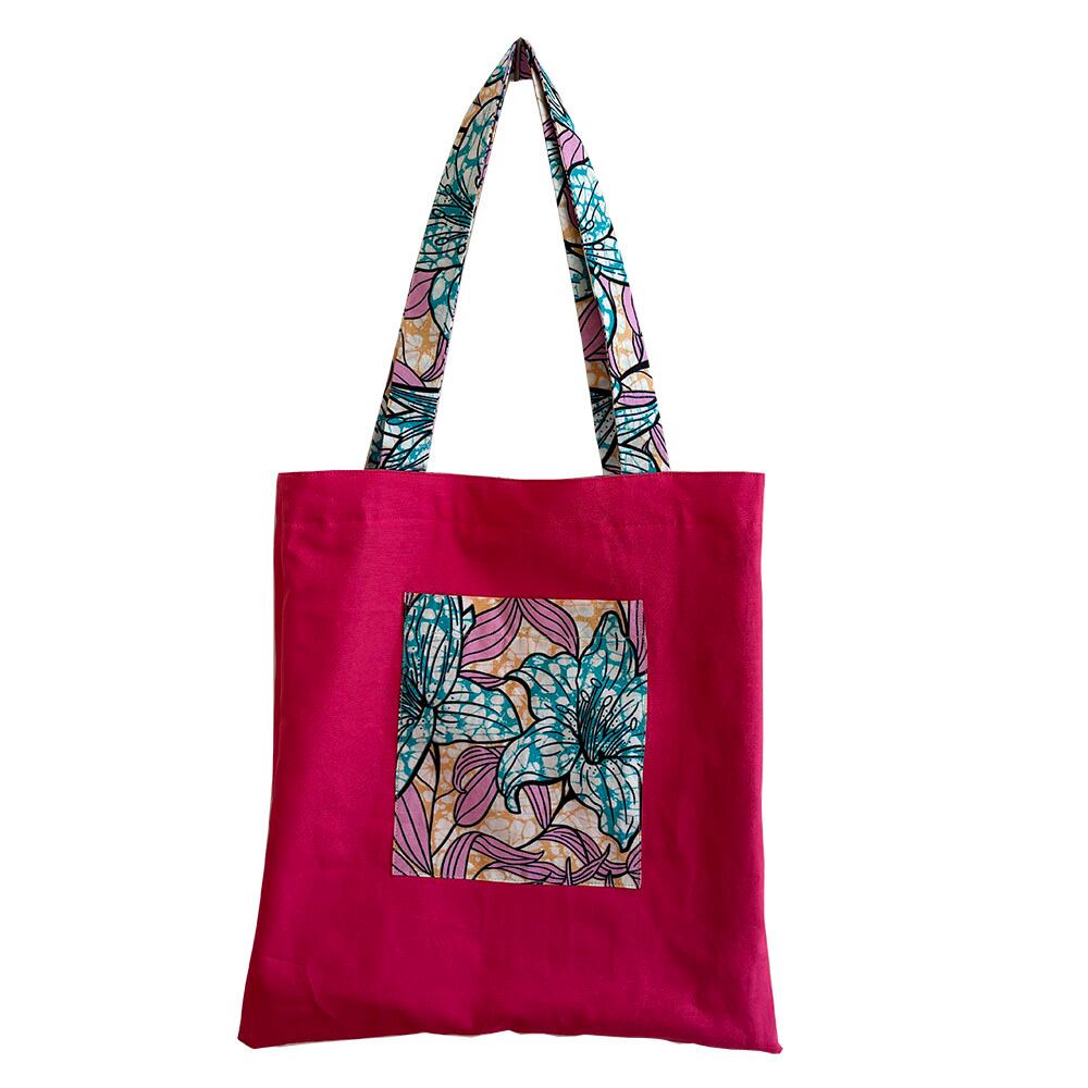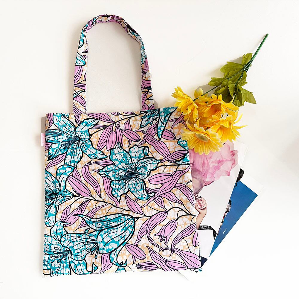 アフリカの大胆な柄で作った少し大きめのトートバッグ。大きすぎず、簡単に持てる便利バッグです。