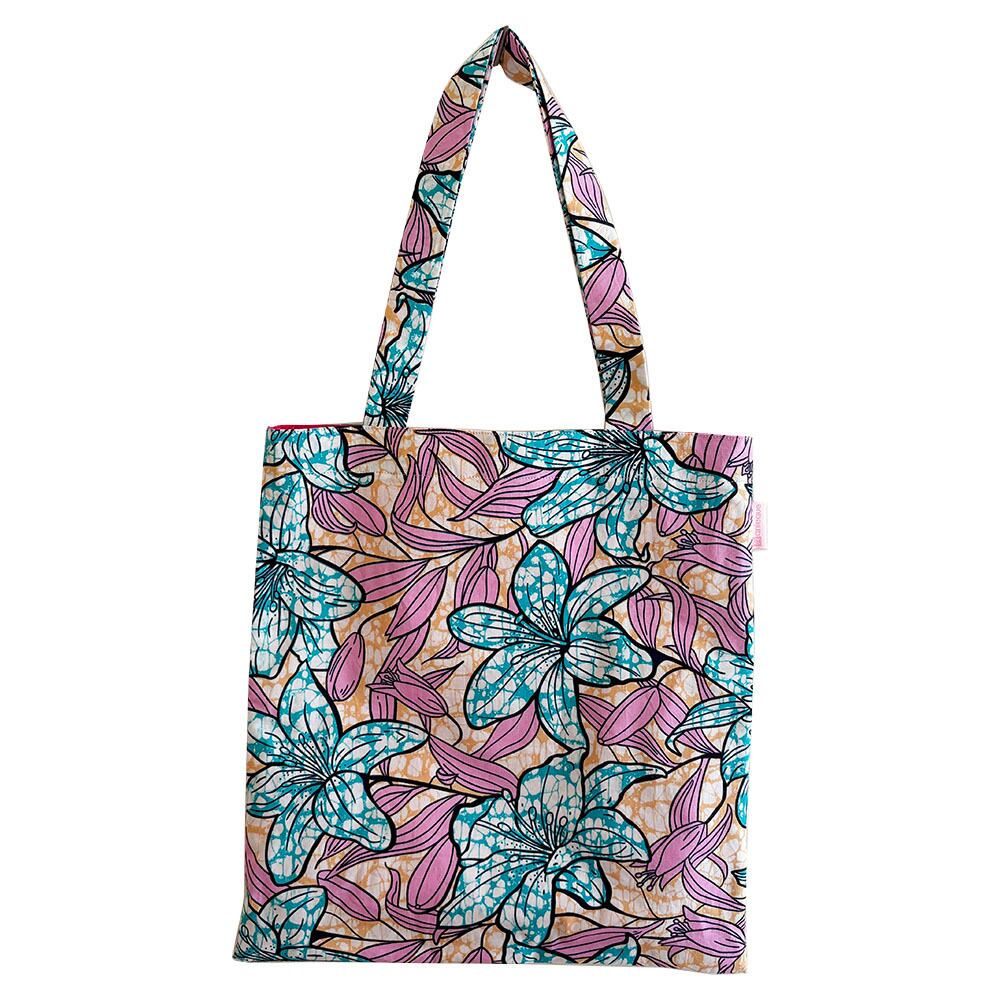 大胆な大柄のアフリカンプリントを贅沢に使用した、存在感のあるトートバッグ。