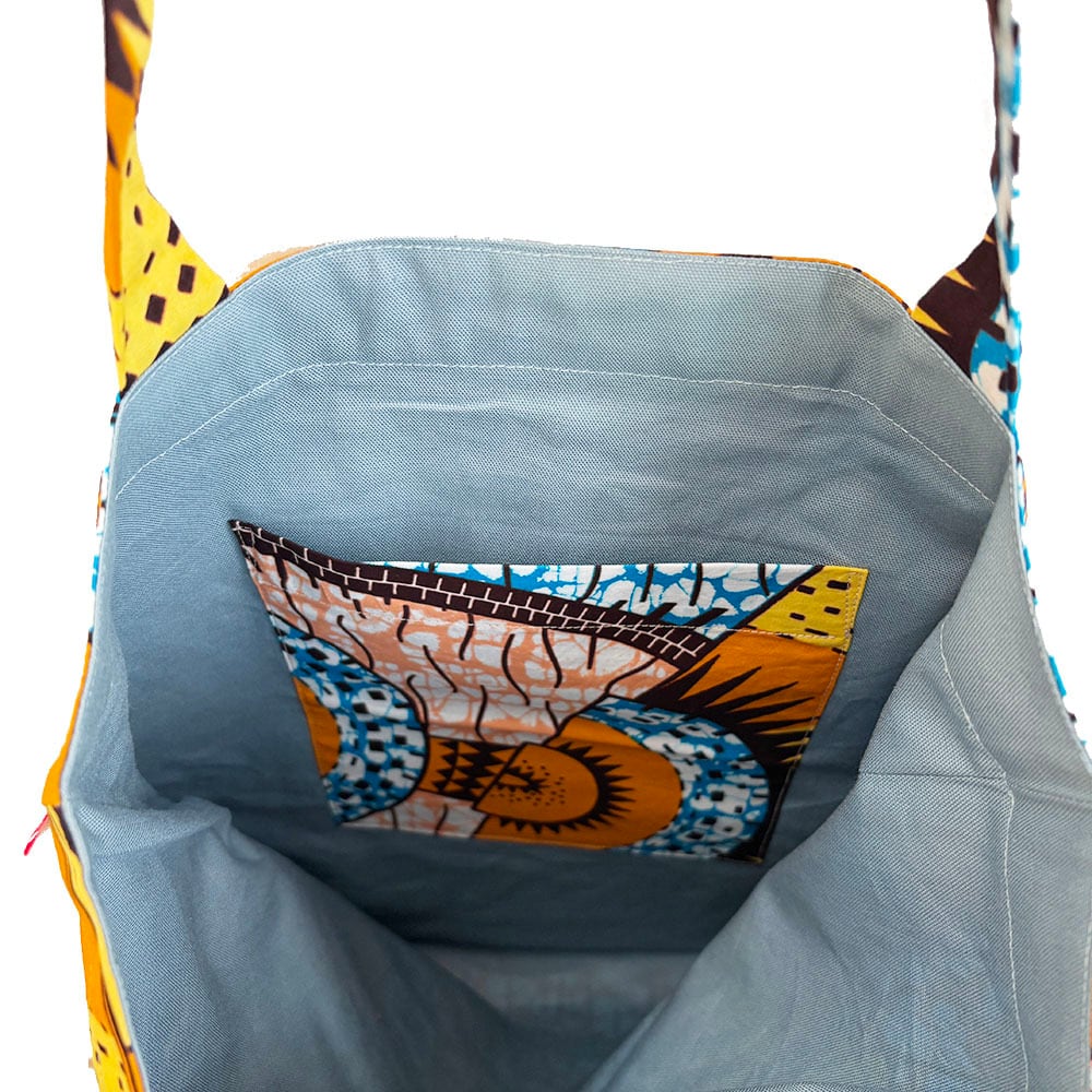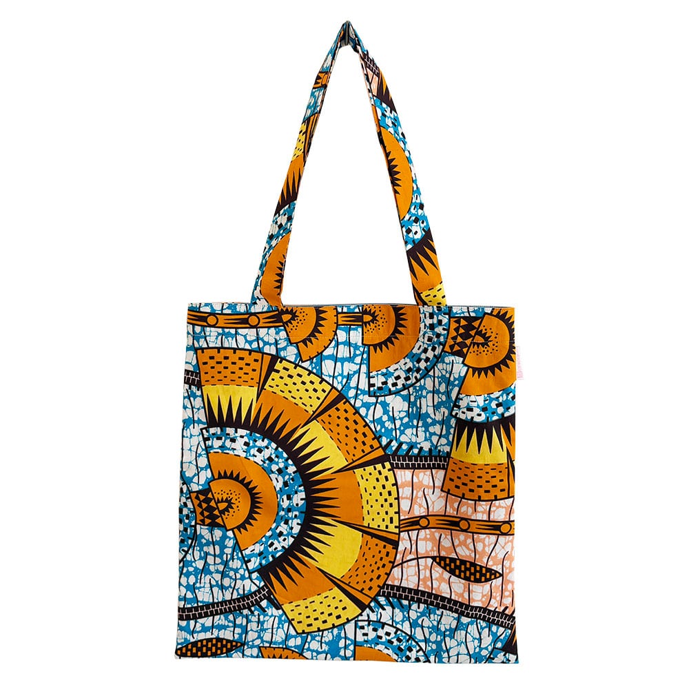 大胆な大柄のアフリカンプリントを贅沢に使用した、存在感のあるトートバッグ。