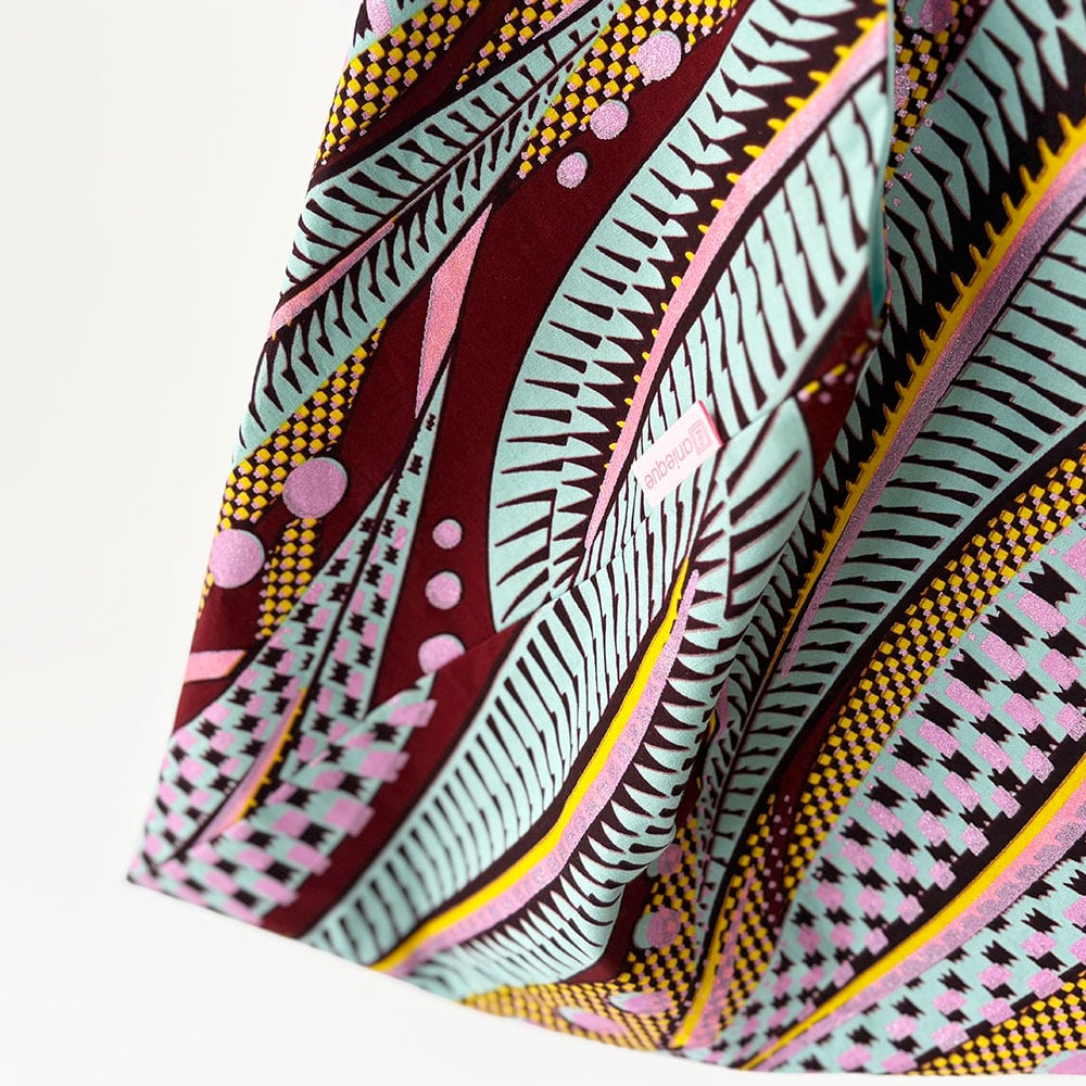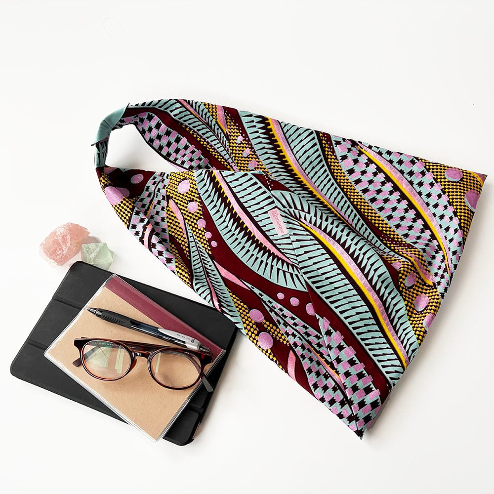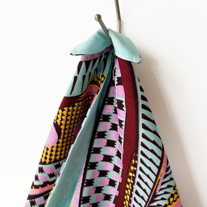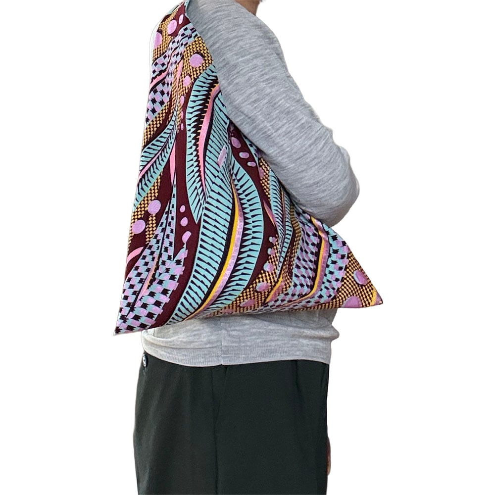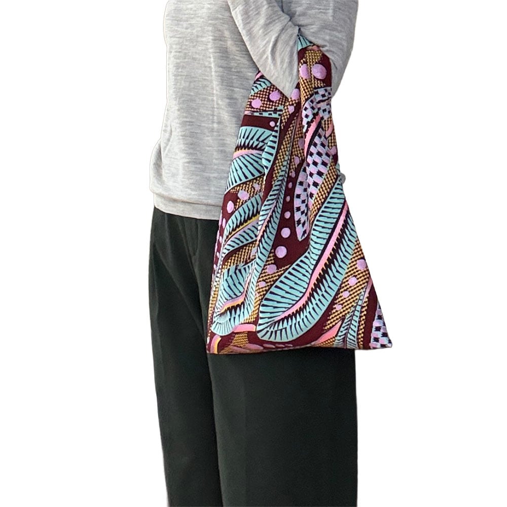 日本の手拭いから生まれた伝統的な「あずまバッグ」を、鮮やかなアフリカンプリント生地で仕立てました。少し縦長のサイズ感で、持ったときにすっきりとした印象。装いのアクセントとしても映えるデザインです。