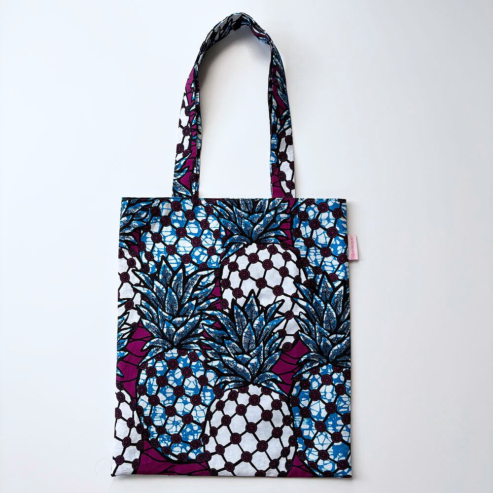 パイナップルモチーフが印象的なアフリカンプリント。深みのあるワインカラーにブルーの葉が映える、ポップな中にも落ち着きのあるデザインです。並んだパイナップルのモチーフがリズミカルで、持つだけでコーディネートのアクセントに。ネオンハンドルとの組み合わせが、ほどよい遊び心をプラスしています。