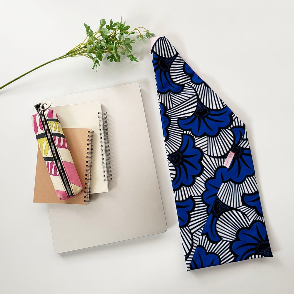 日本の手拭いから生まれた伝統的な「あずまバッグ」を、鮮やかなアフリカンプリント生地で仕立てました。少し縦長のサイズ感で、持ったときにすっきりとした印象。装いのアクセントとしても映えるデザインです。